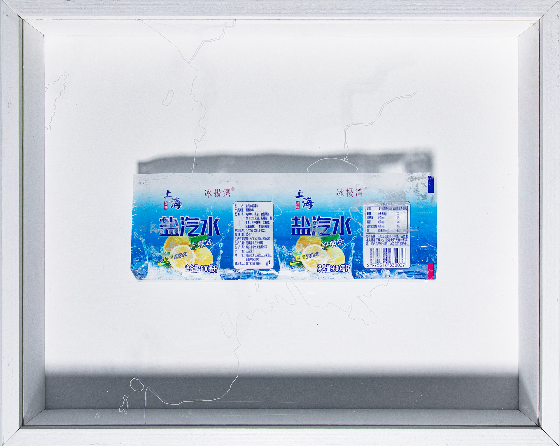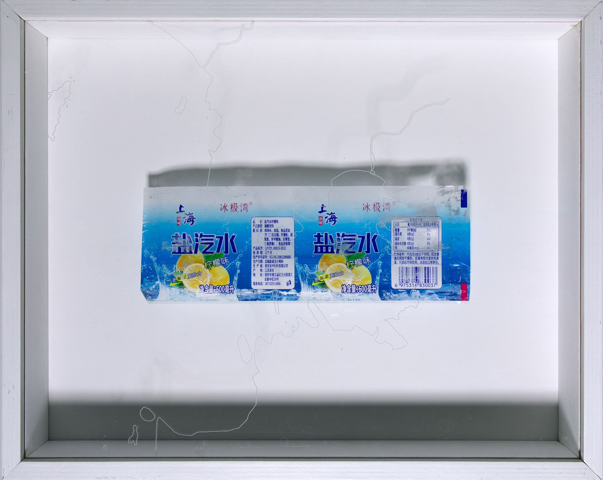 2025, found labels, plywood, acrylic, Dimensions: 303mm x 380mm